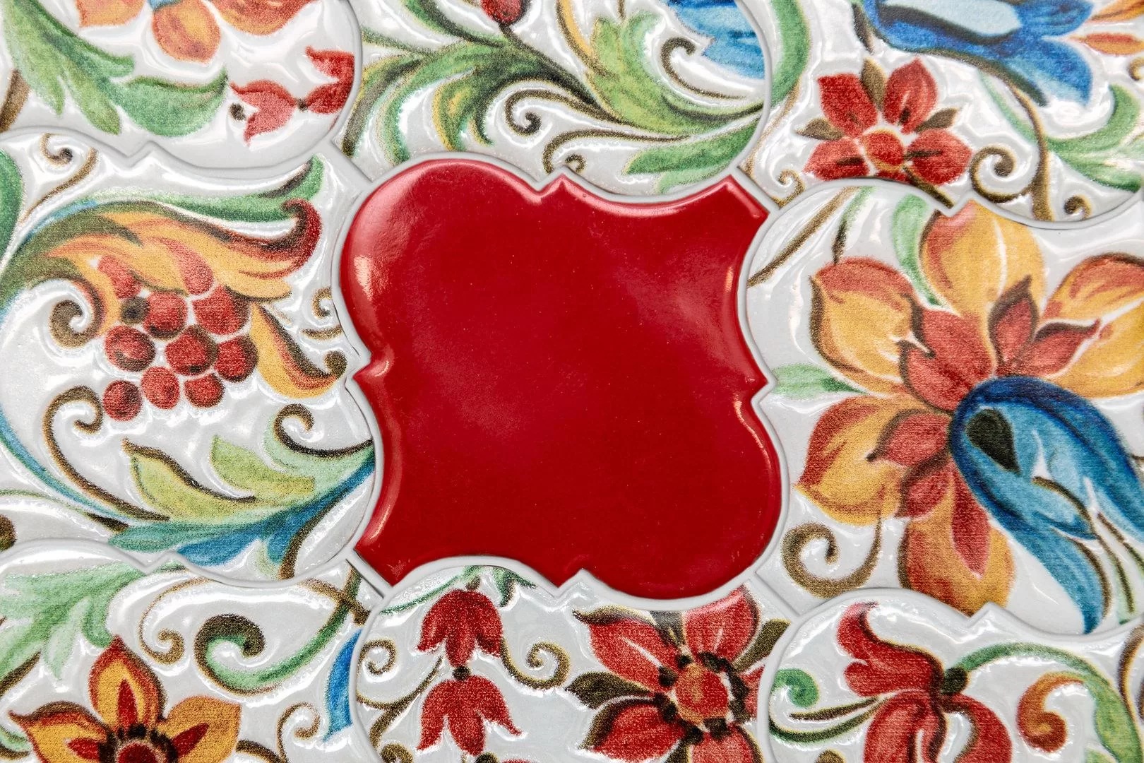 - Плитка Арабески Тоскана с рисунком - яркая в стиле модерн, представлена в наиболее подходящем цвете - белый или бордовый;