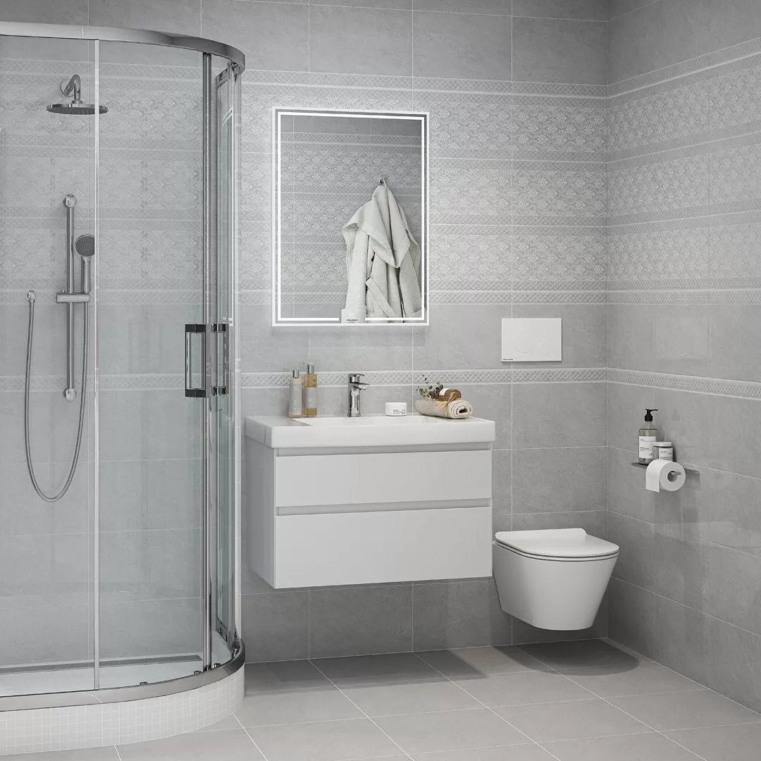 - Керамика Мотиво с рисунком - под камень в стиле модерн, представлена в наиболее подходящем цвете - светло-серый или серый;