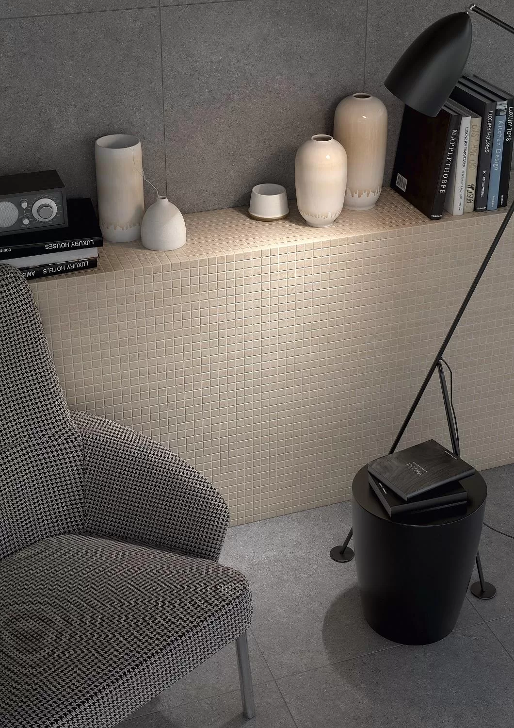 - Керамика Вяз с рисунком - под дерево в стиле лофт, представлена в наиболее подходящем цвете - антрацит или бежевый;
